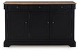 Raise the bar on modern farmhouse style with this dining buffet. Its handsome good looks are accentuated with a two-tone finish and a casual butcher block veneer top. The sturdy silhouette adds a hearty element, whether your style is vintage, country or eclectic. Three drawers and three cabinets with adjustable shelves serve your entertaining needs well.