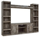 This entertainment center is sure to win your heart with its daring designer take on modern rustic. Its crisp, clean and minimalist-chic profile is enriched with a striking replicated oak grain with thick plank styling and a rustic gray finish for that much more authentic character. Crossbuck detailing adds a brilliant barn door inspired touch.